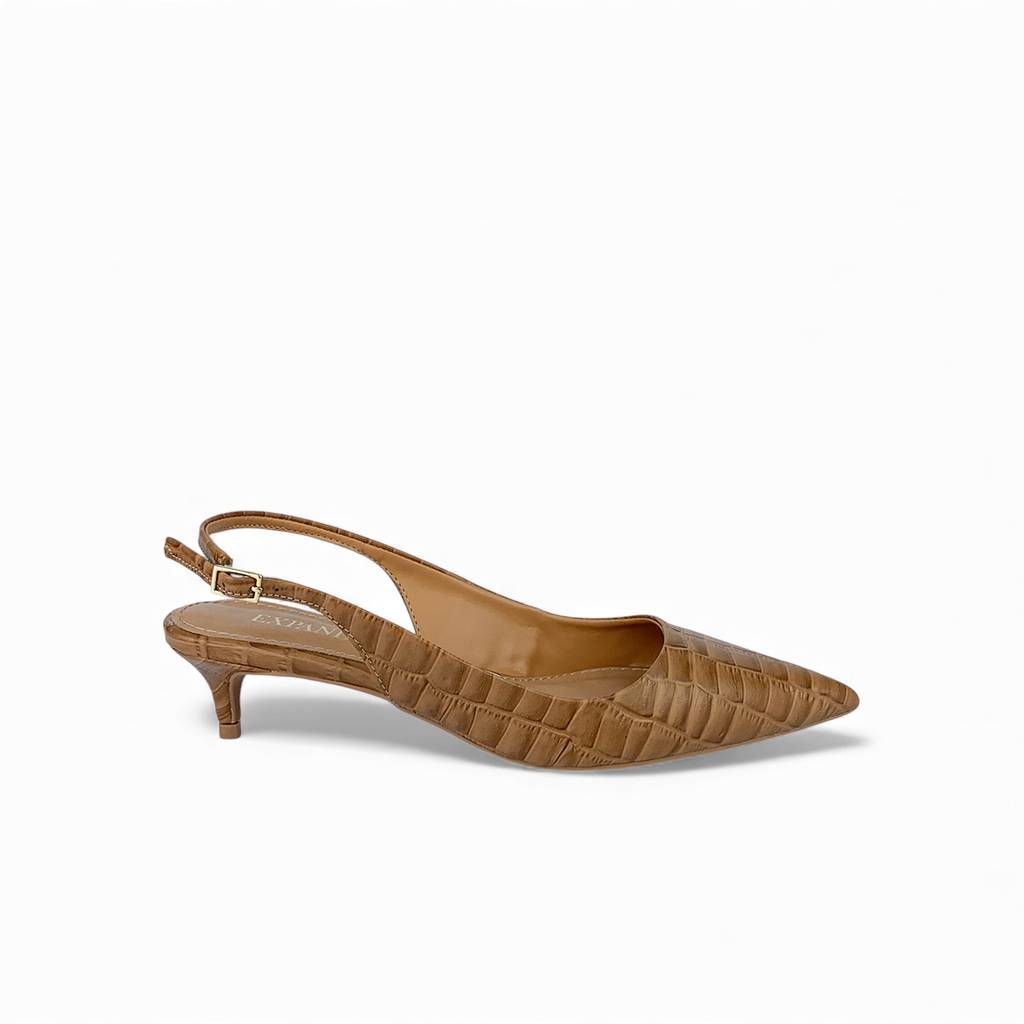 Scarpin slingback croco com salto baixo. Sofisticação e presença em cada passo — para quem faz do estilo uma declaração pessoal.