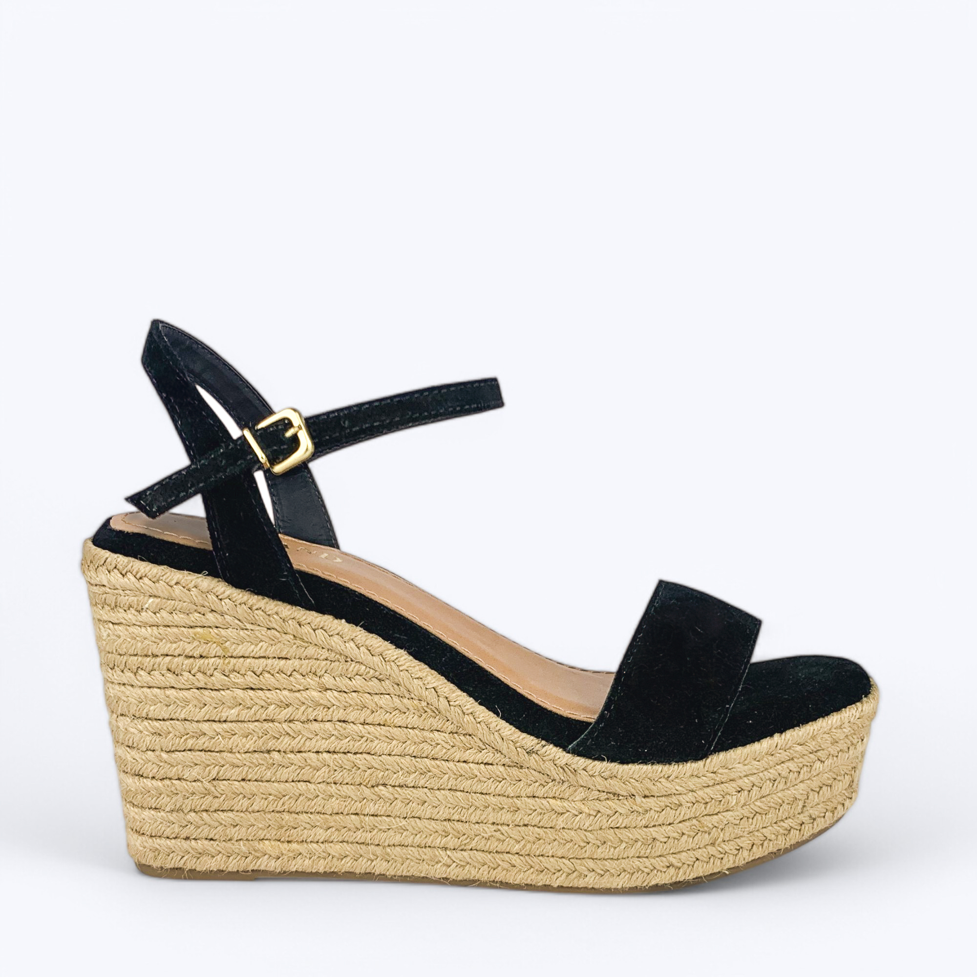A sandália preta em camurça é versátil e atemporal. O modelo com salto anabela em corda traz o equilíbrio perfeito entre conforto e estilo, adicionando um ar natural e moderno ao look. Perfeita para compor produções casuais ou sofisticadas, é aquele item indispensável para quem busca praticidade sem abrir mão da elegância.