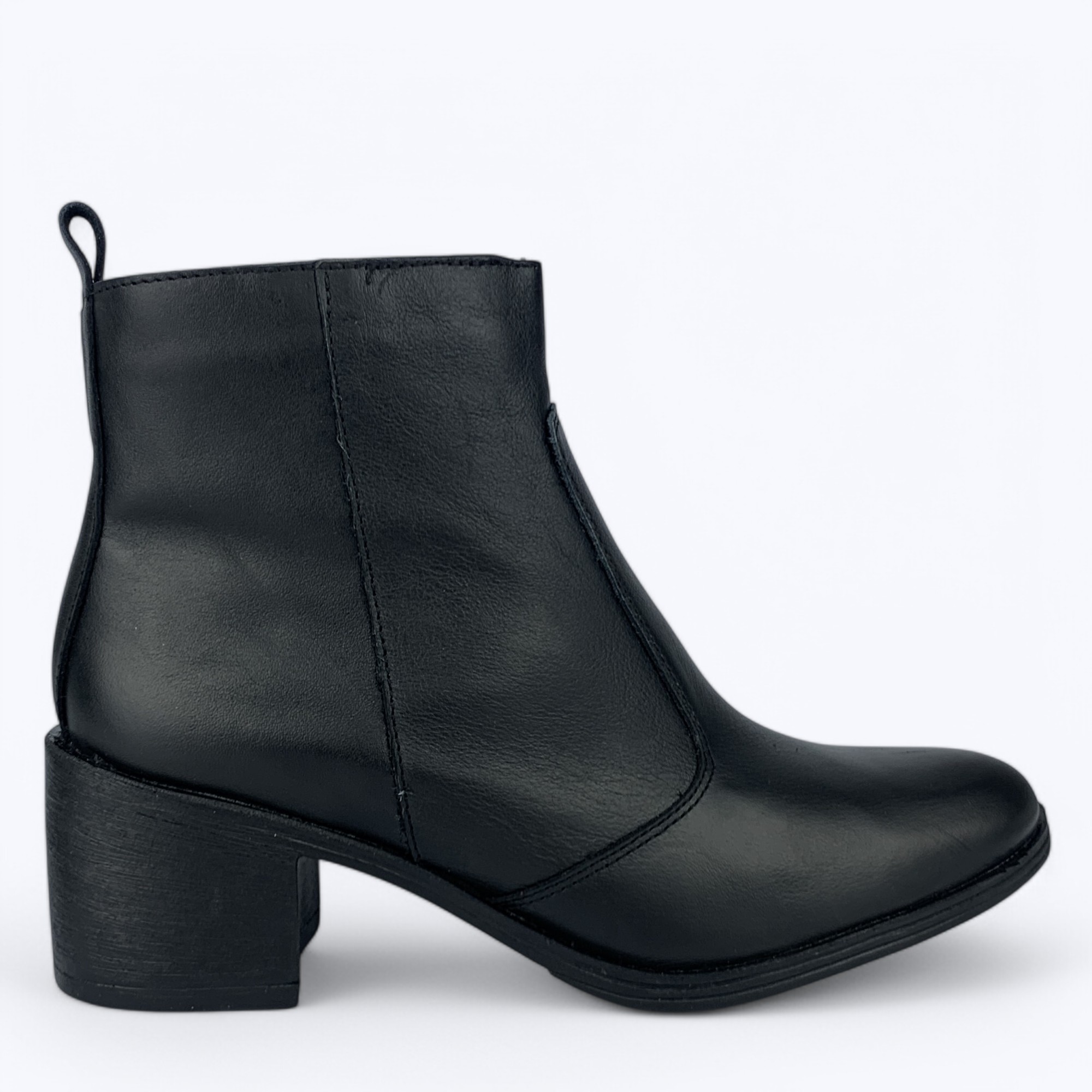 A bota em couro preta é elegante e atemporal. O salto bloco garante conforto, enquanto o cano médio adiciona versatilidade às produções do dia a dia ou da noite..