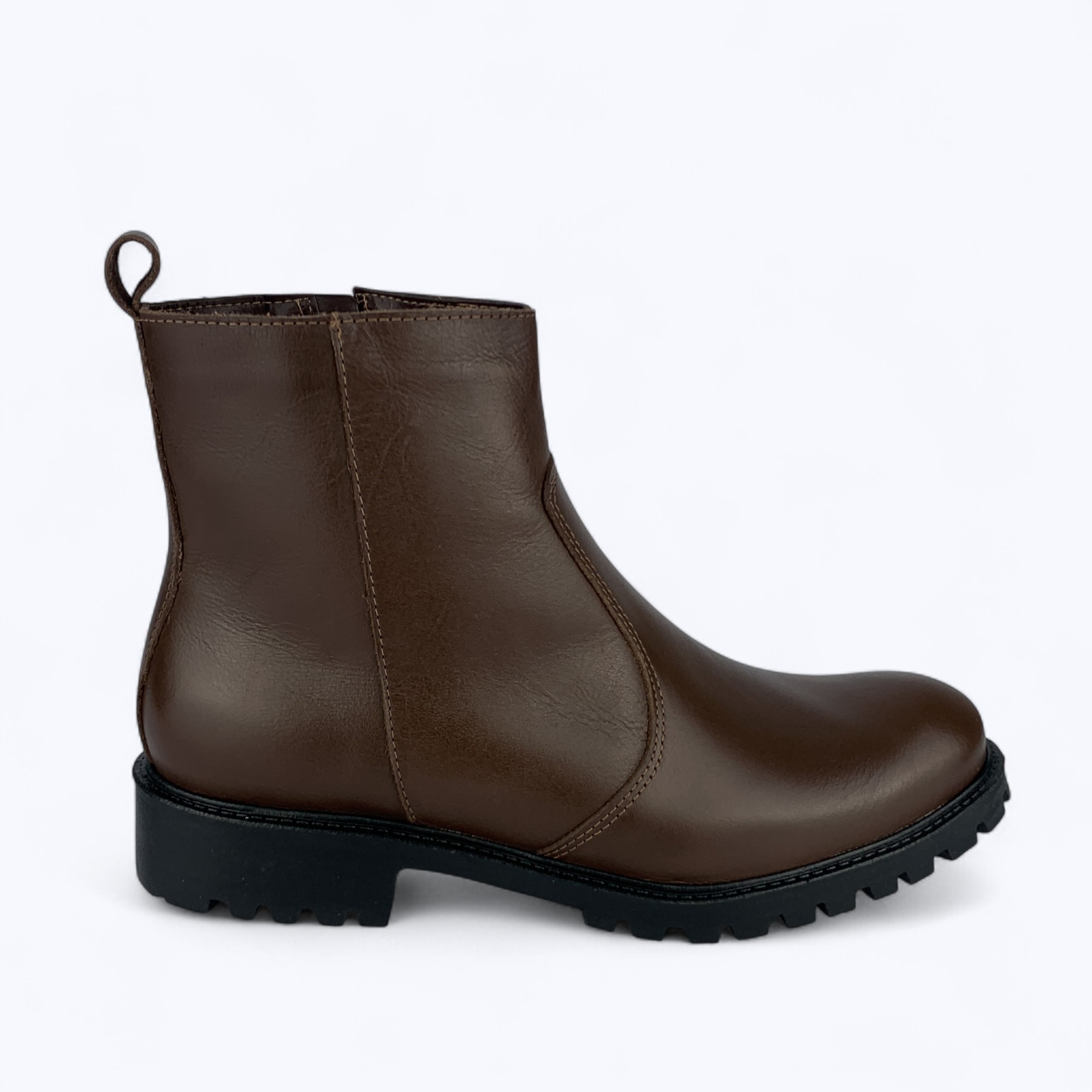O coturno em couro marrom combina estilo e praticidade. A sola tratorada traz personalidade e conforto, enquanto o cano médio garante versatilidade para composições modernas..