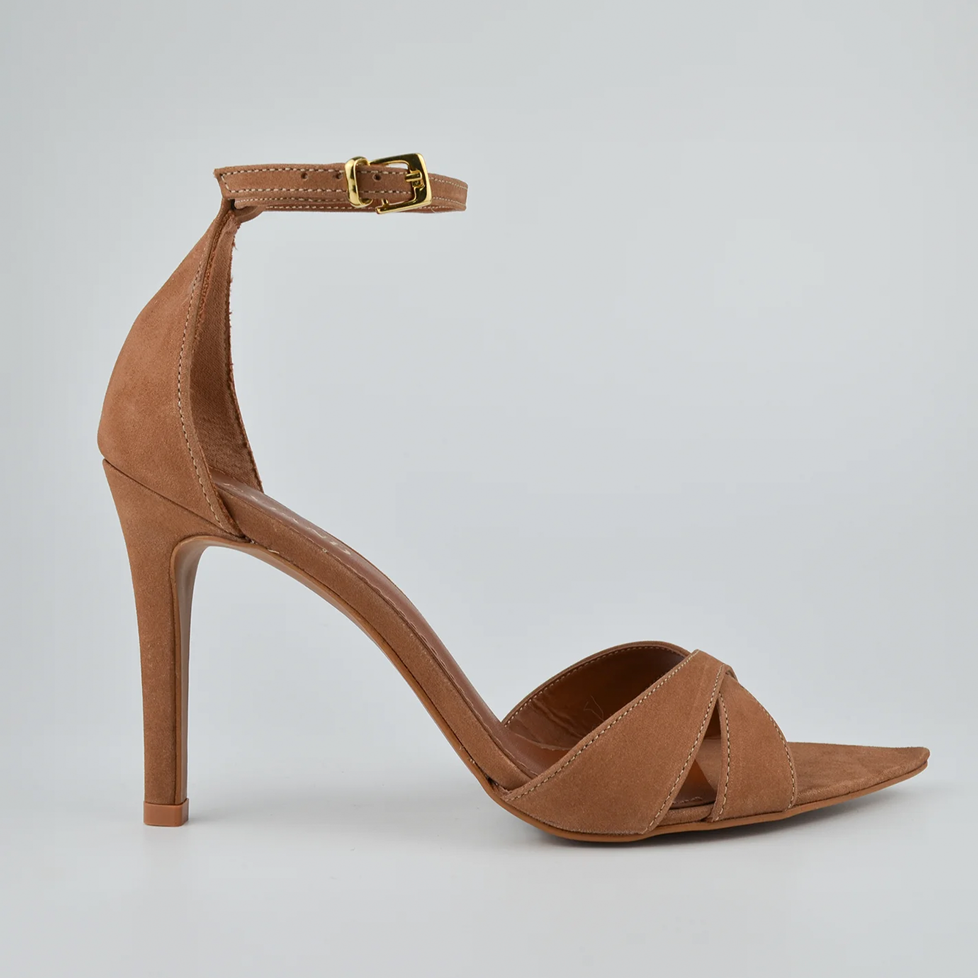 Com tiras em X no nobuck baunilha e salto alto imponente, a sandália traz o bico folha como detalhe elegante. Sofisticada e versátil, é a escolha ideal para produções noturnas..