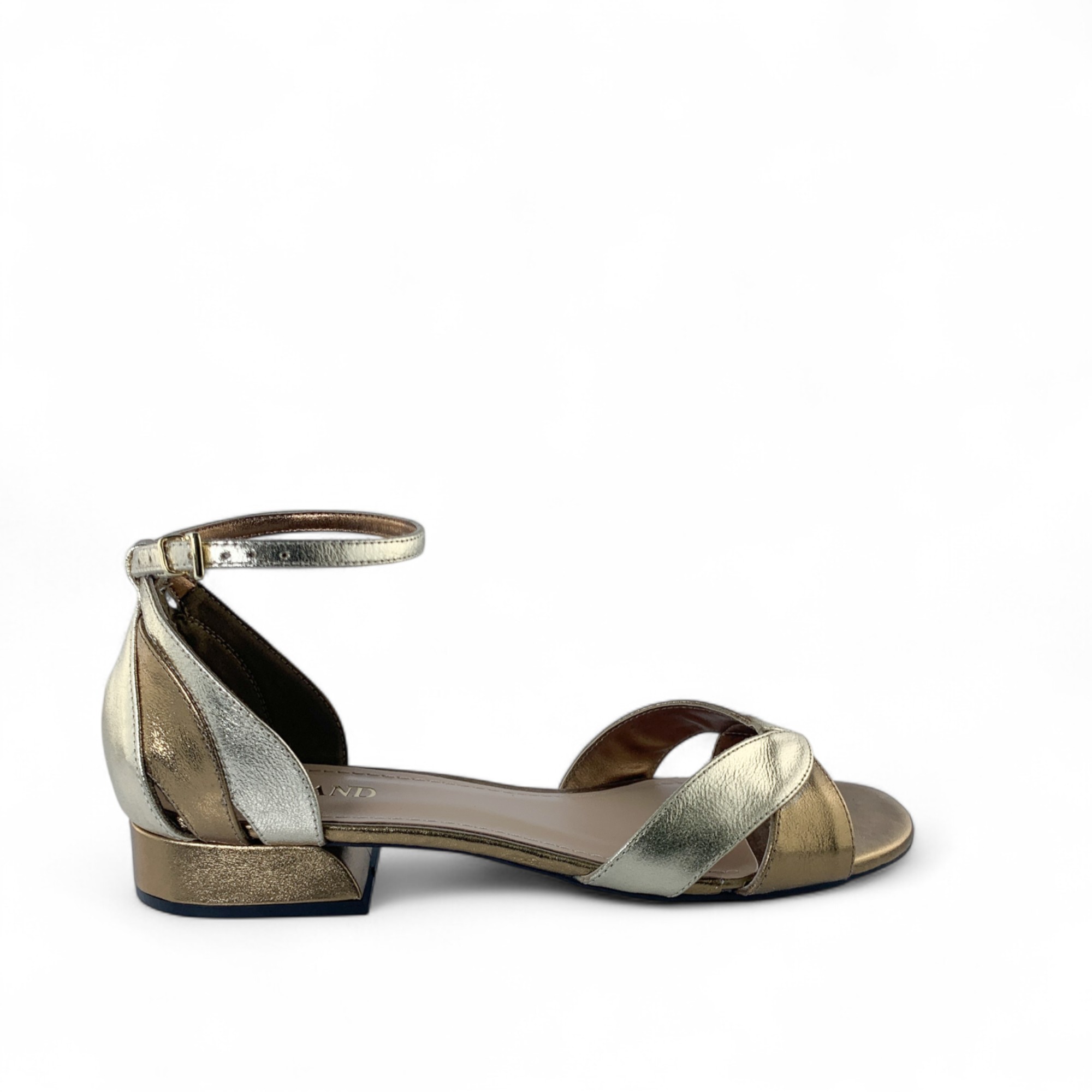 A sandália em tom cristal ouro velho metalizado combina delicadeza e sofisticação. O detalhe em folhas valoriza o design, conferindo elegância discreta a produções especiais..