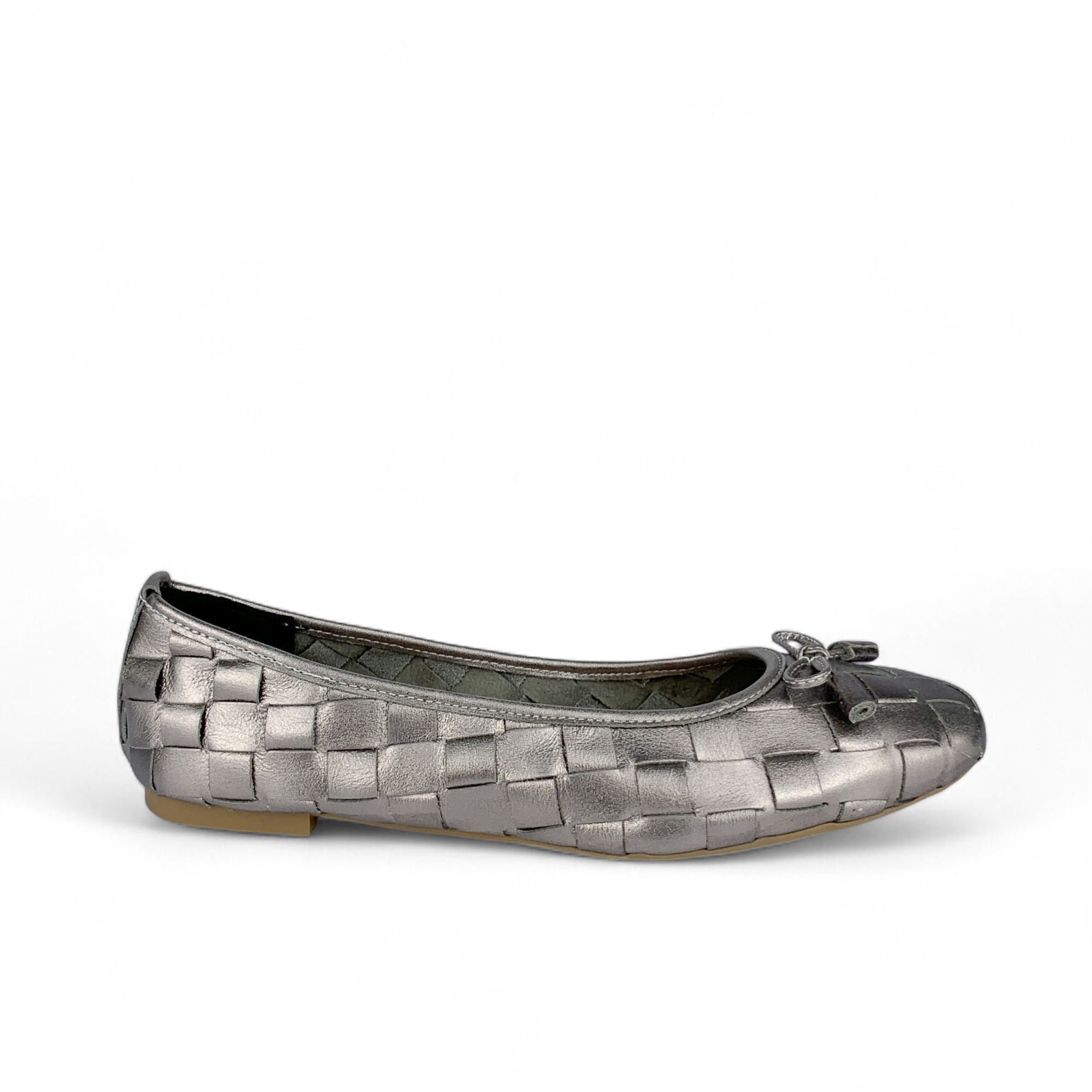 A sapatilha metalizada em tom ônix é delicada e sofisticada. O matelassê confere charme clássico, enquanto o laço adiciona feminilidade, tornando o modelo perfeito para compor looks elegantes no dia a dia..