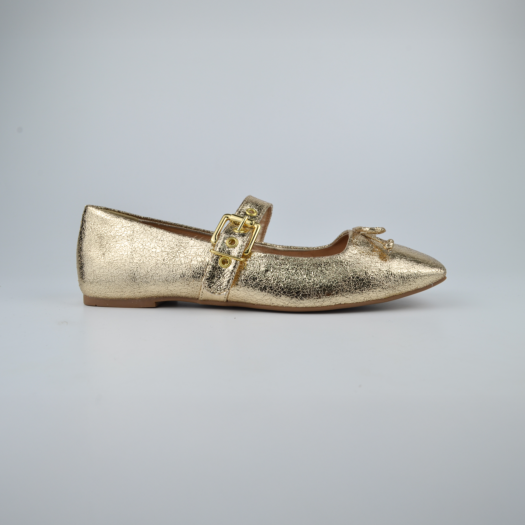 Em metalizado ouro light a sapatilha com fivela une elegância e praticidade, acrescentando um toque refinado às produções do dia a dia..