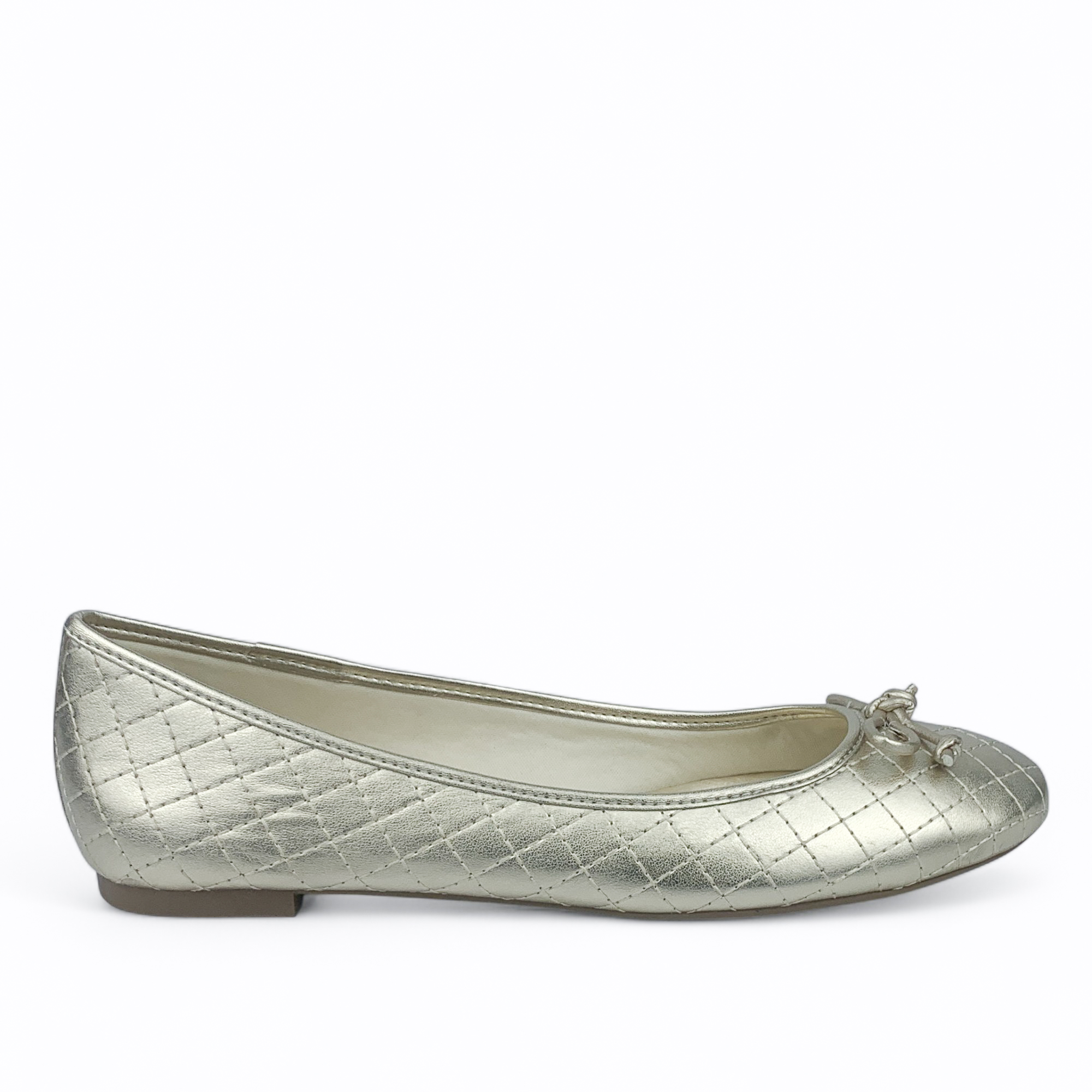 A sapatilha metalizada ouro light com matelassê e laço é a escolha perfeita para unir feminilidade e elegância em produções atemporais..