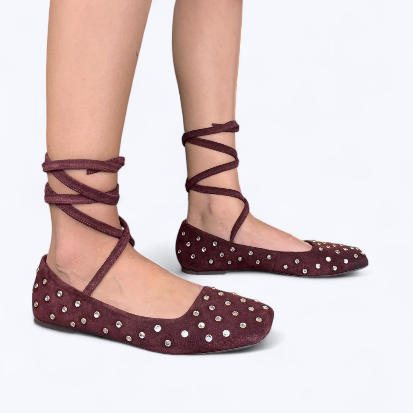 A sapatilha em camurça marsala traz o charme da bailarina com toque moderno. Detalhes cravejados e cordão delicado elevam a peça, unindo conforto e sofisticação para o dia a dia..